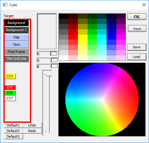 Default color combinations are applied by clicking Default 1-Default 3 buttons.