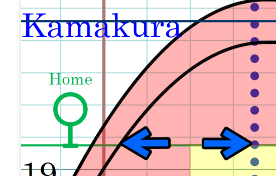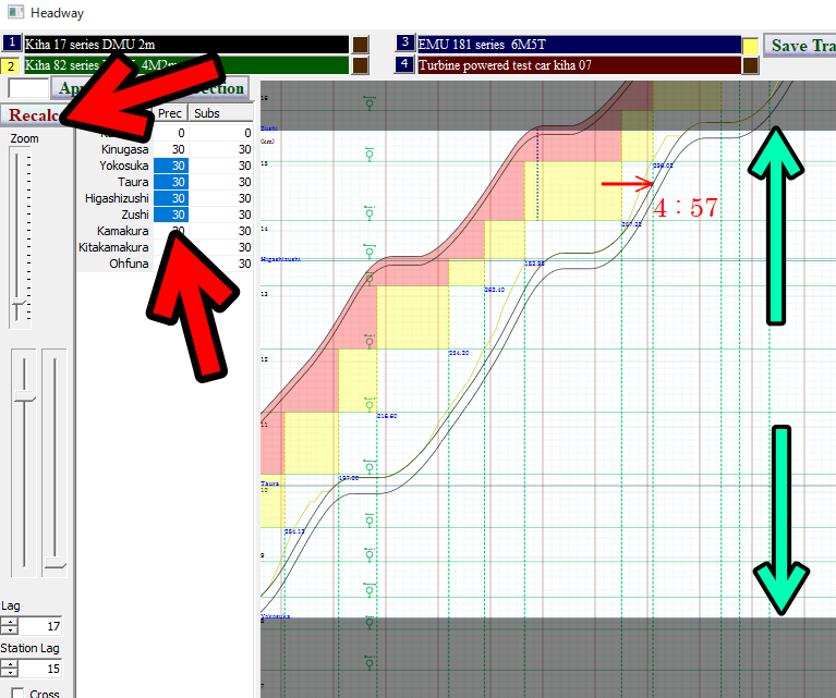 Red arrowd controls change the lag time between the preceding train passes through a home signal and the operator of the following train can recognize the signal. This includes the time lag of changing a signal aspect and the operator's perception.